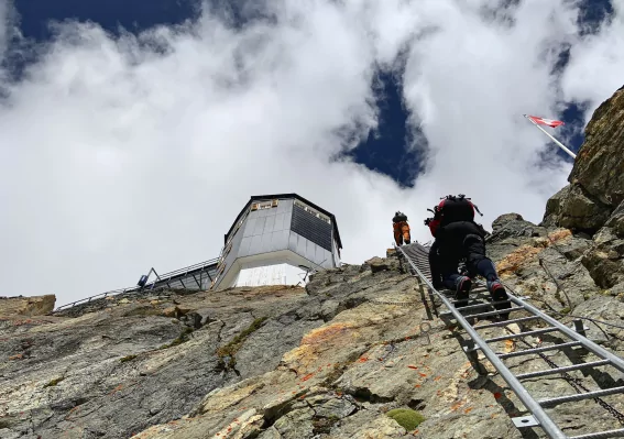 Nach so einer Etappe kann man den nächsten Tag schon mal etwas ruhiger angehen lassen und so schlafen wir bis 8 Uhr morgens und gönnen uns ein ausgedehntes Frühstück. Unser nächstes Ziel ist die legendäre Bertol Hütte, die wie ein Adlerhorst exponiert auf einem Felsgrat oberhalb der gleichnamigen Scharte liegt. Über mehrere Eisenleitern erreichen wir am frühen Nachmittag die Hütte und genießen die Aussicht über gewaltige Gletscherflächen und die zahlreichen 4000er Gipfel der Walliser Alpen .