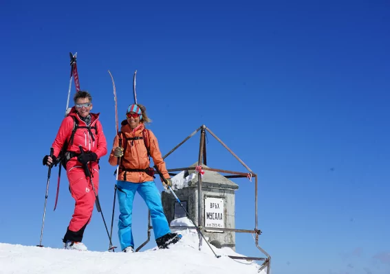 Da wir gut im Zeitplan sind orientieren wir uns zunächst in eine andere Richtung und steigen knapp 400 m einen schönen Osthang hinauf und weiter auf einen kleinen namenlosen Gipfel. Die Belohnung für den kleinen Abstecher ist die Abfahrt durch ein schattiges Pulver-Couloir. Jetzt wenden wir uns dem Hauptziel des heutigen Tages zu und am frühen Nachmittag erreichen wir mit Ski am Rucksack den höchsten Punkt der Balkanhalbinsel. Die letzten Meter zum Gipfel erreicht man nur zu Fuß über einen mit Drahtseilen gesicherten Grat. Am Gipfel befinden sich mehrere Bauwerke der vergangenen Epoche, unter anderem eine bemannte meteorologische Station. Wir nutzen das schöne Wetter für eine ausgedehnte Pause. Wenn die Gipfelflanke/Rinne nicht zu hart ist kann man direkt hinter der markanten Gipfelmakierung einfahren, ein Sturz hätte sehr unangenehme Folgen, ansonsten von weiter unten am Grat. Die Abfahrt folgt dann mit leichten Variationen dem Aufstiegsverlauf und zum Schluss dem über 10 km langen Skiweg nach Borowez.