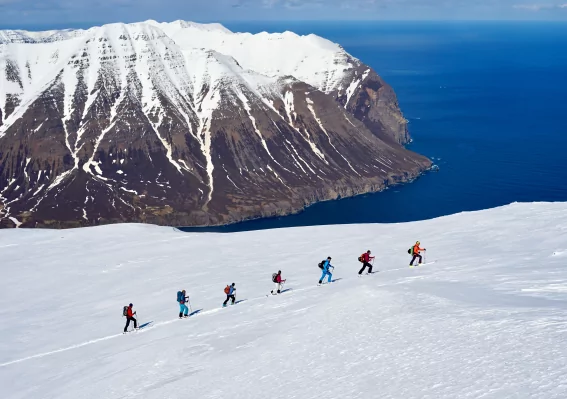 Eine der besten Regionen für Skitouren ist die Tröllaskagi, eine von mehreren kleinen Fjorden gegliederte Halbinsel in der Nähe von Akureyri, der zweitgrößten Stadt im Norden Islands. Viele der Berge an den Fjordufern erreichen Höhen um die 1.000 m und locken mit perfektem Skigelände und Abfahrten bis ans Meer. Sogar kleinere Skigebiete sind hier zu finden. Früher lebte die Region vom Fischfang, inzwischen ist der Tourismus die wichtigste Einnahmequelle.