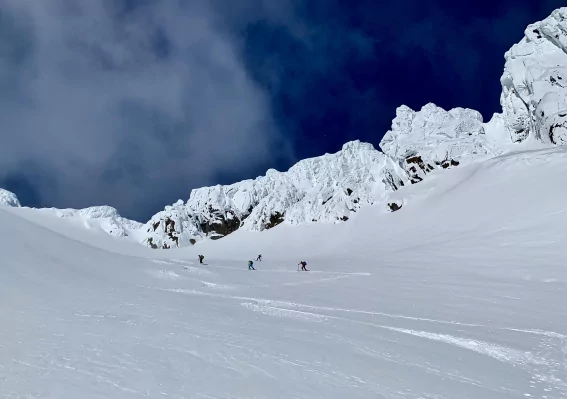 Hier heißt es die Ski auf den Rucksack zu schnallen und über den letzten ca. 40° steilen kurzen Hang geht es mit Steigeisen zum Gipfel. Inzwischen sind wir nicht mehr die einzigen am Berg, über die Westseite kommen weitere Tourengeher nach oben, wobei die meisten den Gipfel auslassen und direkt das Südcolouir ansteuen. Eigentlich hatten wir auch die Abfahrt über das Südcouloir geplant, aber da diese Abfahrt nicht viel Platz bietet und im oberen Teil schnell zu einer Buckelpiste wird, entscheiden wir uns für den gleichen Rückweg.