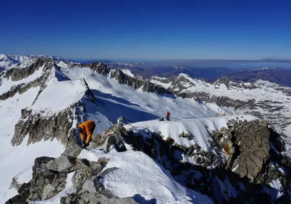 In den Alpen wäre er einer unter vielen, hier sind die 3408 Meter ein Rekord. Nach der Aigüestortesdurchquerung übernachten wir ein letztes Mal in Tavascan, um am nächsten Tag gemütlich in Richtung Aneto zu fahren. Nicht auf dem schnellsten Weg, sondern auf der schönsten und interessantesten Strecke. Nach etwa drei Stunden kommen wir am Talort Benasque an. Das alte Bergdorf ist nicht vom Tourismusboom verschont geblieben, hat sich aber einen schönen Ortskern bewahrt. Wer sich noch Ausrüstung besorgen will, findet in den vielen Sportgeschäften hier sicher das Passende. Weiter geht es mit dem Pkw bis Llanos de Hospital auf 1900 Metern Höhe. Ab hier steigen wir mit Skiern zwei Stunden zur Renclusahütte auf, zuerst über eine Langlaufloipe, dann noch 300 Höhenmeter durch lichten Bergwald. Der nächste Tag gilt ganz dem höchsten Punkt der Pyrenäen. Zuerst müssen wir über steile Hänge zur Portilla Superior aufsteigen, um dann auf der anderen Seite mit einer langen Querung den Aneto zu erreichen. Der Gipfelaufbau hat es nochmal in sich: Meistens ist er blankgeblasen und sehr hart. Steigeisen sind hier Pflicht. Die letzten Meter zum Gipfel führen über einen Felsgrat. Hier entscheidet der Bergführer über den Einsatz des Seiles. Nach all der Mühe werdet ihr oben mit einer fantastischen Aussicht belohnt: Im Norden reicht der Blick weit nach Frankreich, während man im Süden bei klarer Sicht bis zum Iberischen Rücken südlich von Zaragossa sehen kann. Dazu hat man die gesamten hohen Pyrenäengipfel im Blick. Eine Rundsicht über mehrere Hundert Kilometer! Nun liegen 1600 Höhenmeter Abfahrt vor uns. Ein einziger, langer, nordseitiger Hang. Ein Rausch. Genau der richtige Abschluss einer solchen Woche.