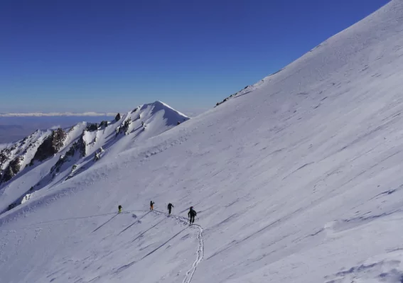 In Cucurbag, einem kleinen, urigen Dorf auf 1400 Meter Höhe nimmt uns Recep Ince in seiner gemütlichen Aladaglar Lodge auf. Schon für den nächsten Tag planen wir ein erstes Highlight: den 3700 Meter hohen Mount Emler. Mit 2300 Hm geht es gleich richtig zur Sache. Sollte für uns Trainierte machbar sein, denken wir, allerdings täuschen die Dimensionen und Entfernungen gewaltig. Ein felsiges Steilstück vor uns will einfach nicht näher kommen und wir haben viel Zeit, uns zu überlegen, wo es einen Durchschlupf geben könnte. Ein schon von weitem sichtbares Couloir löst sich dann aber überraschend auf, wir überwinden es zu Fuß. Vom Gipfel bietet sich dann ein überwältigendes Panorama. Bis weit nach Kappadokien reicht der Blick. Was für ein Kontrast – die glitzernden Hänge vor uns und dahinter weite braunen Ebenen und immer wieder schneebedeckte Berge in der Ferne. Wir können uns gar nicht satt sehen, und haben vor der Vielzahl an fantastischen Skitouren in unserer nächsten Umgebung die Qual der Wahl für die nächsten Tage.