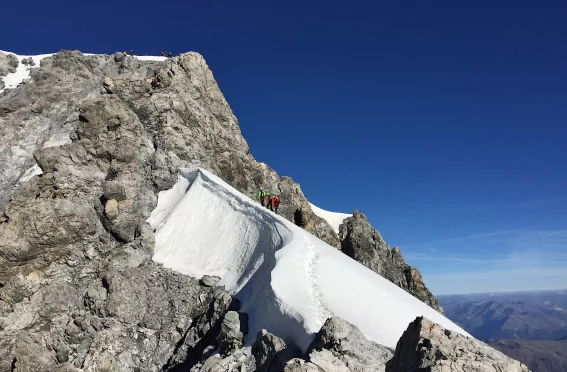 • Steile Firn- und Eisflanken über 45° und ausgesetzte Grate.