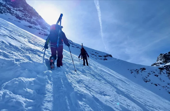 Mit den Ski am Rucksack geht es steil über den Meitin Gletscher hoch aus Plateau du Couloir 3.650 m. Anschließende Abfahrt zum Col du Sonadon, 3.504 m und weiter über den Glacier du Mt. Durand Richtung Cabana Chanrion, 2.460 m, die wir nach einer Stunde Gegenanstieg erreichen.