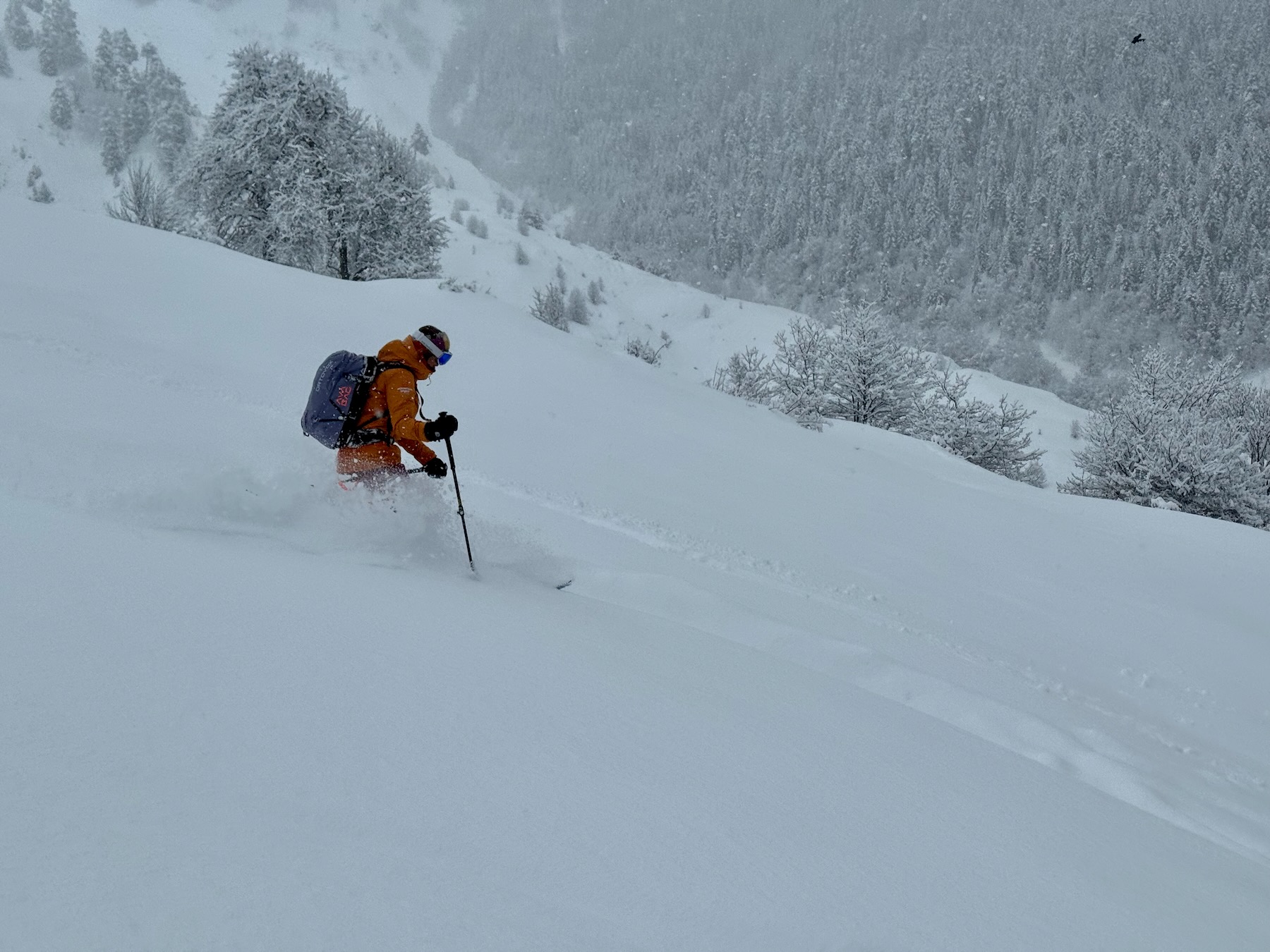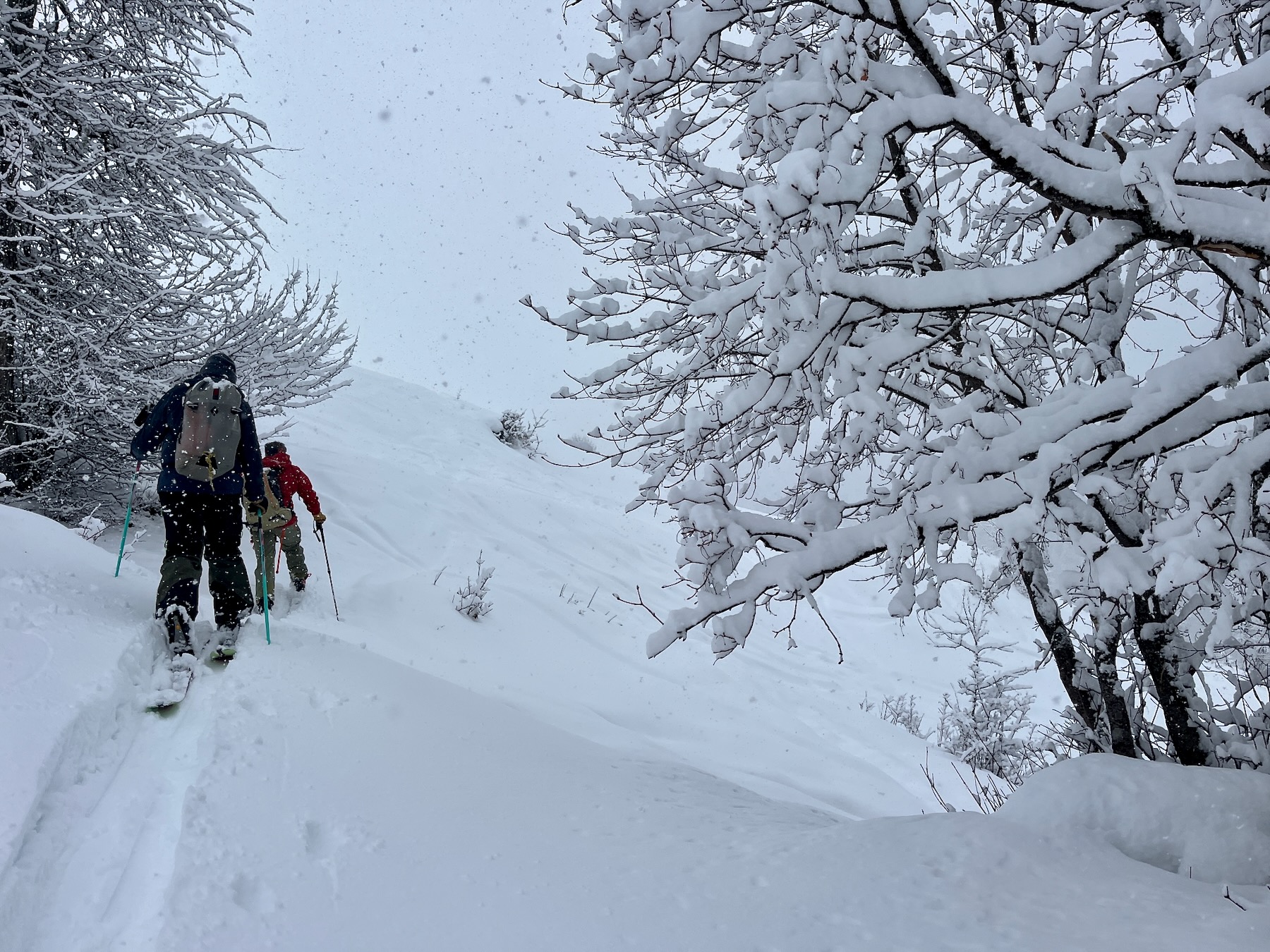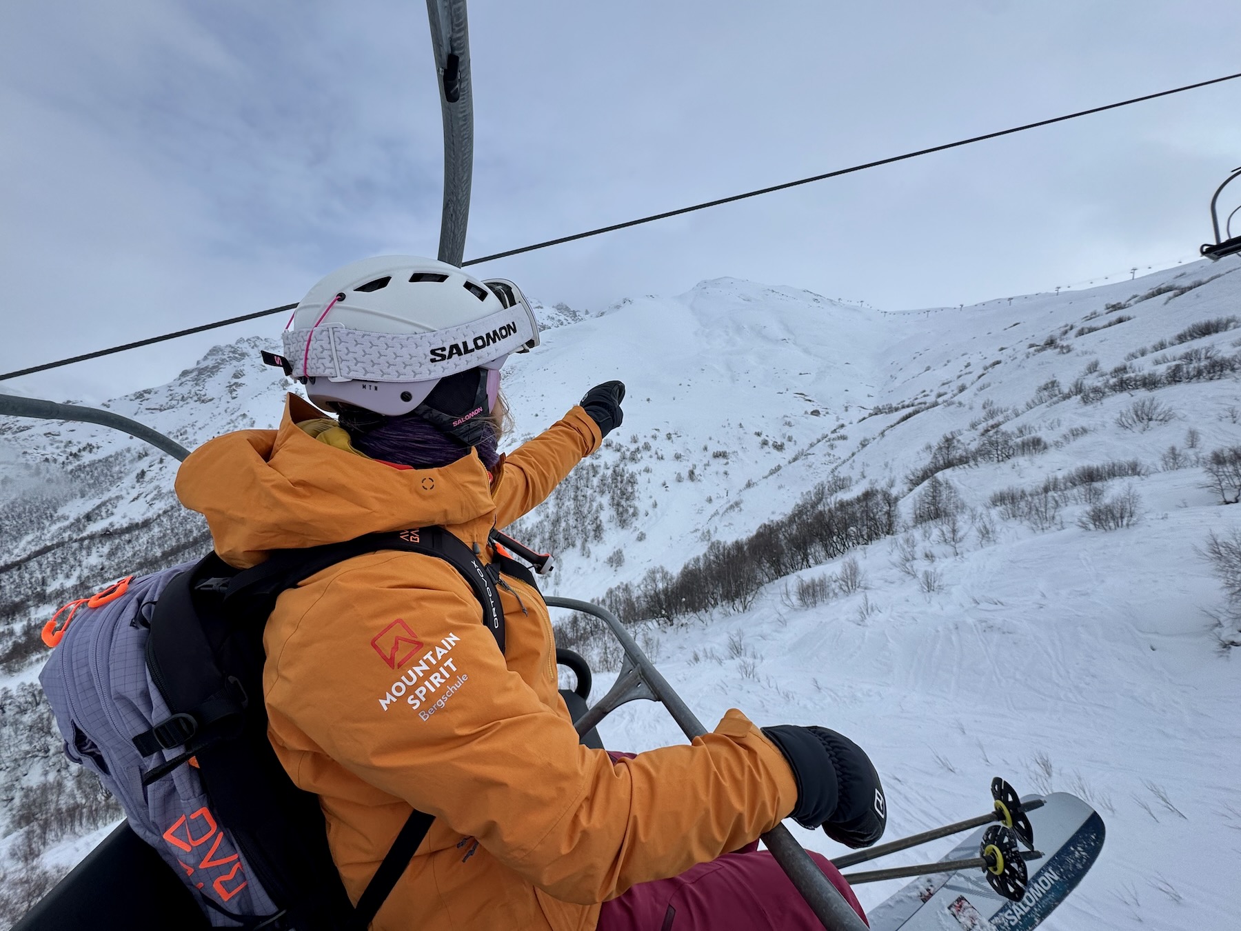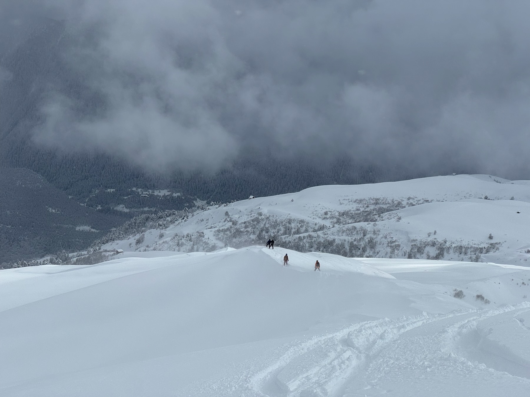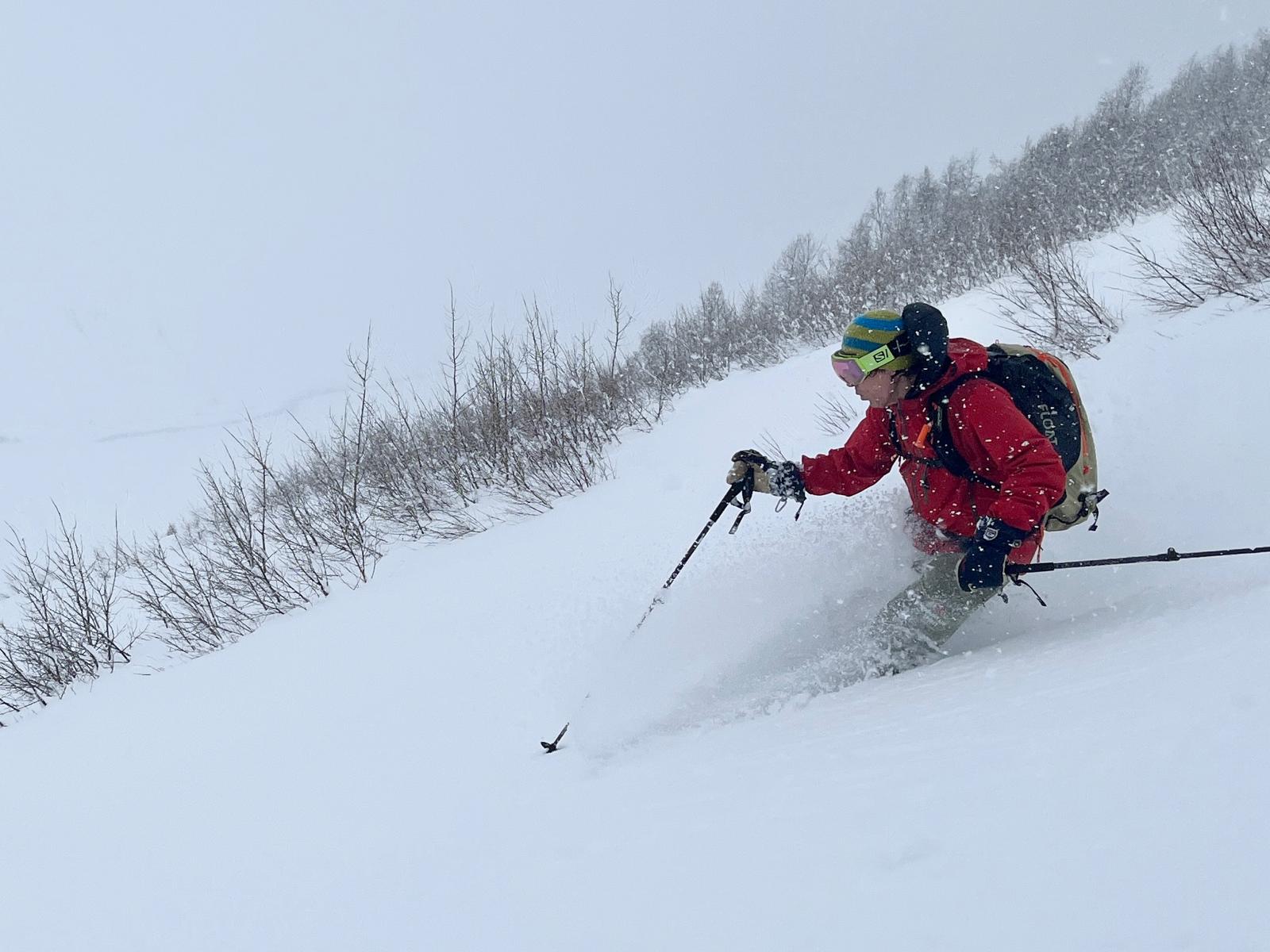 Heute fahren wir von unserer Unterkunft zunächst ein paar Meter hinunter und steigen dann Richtung Mt. Gvibari auf. Die Nordhänge dieses Berges bieten mehrere Aufstiegs- und Abfahrtskombinationen. Hier finden wir einige der besten Abfahrten in der Region. Gleichmäßig geneigt, schneesicher und viel Platz für „First Lines“.
