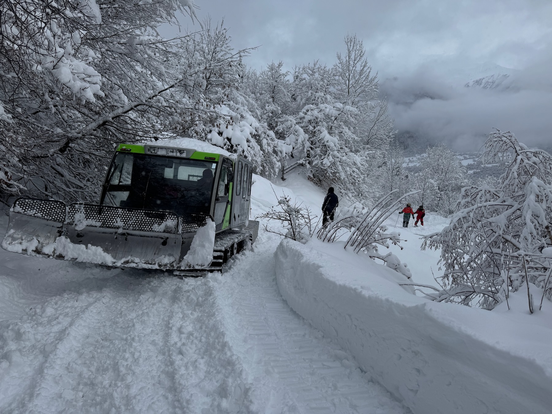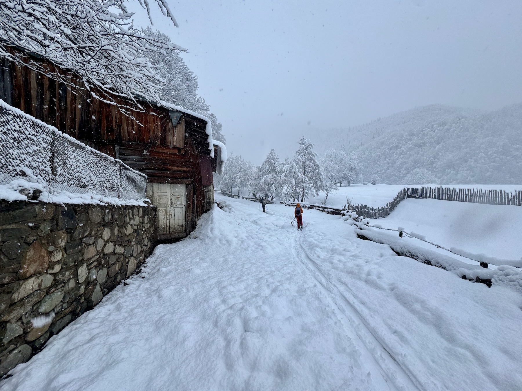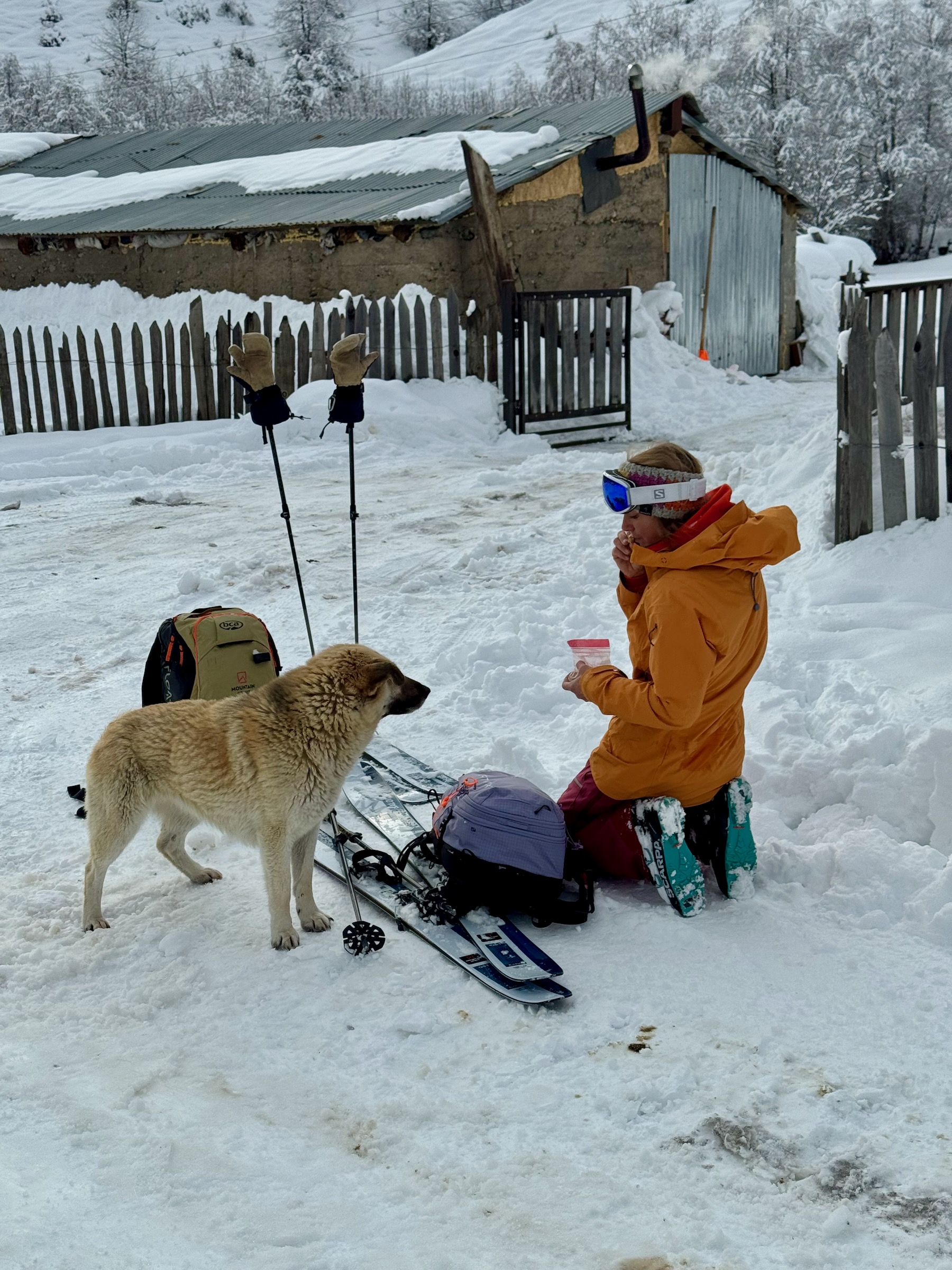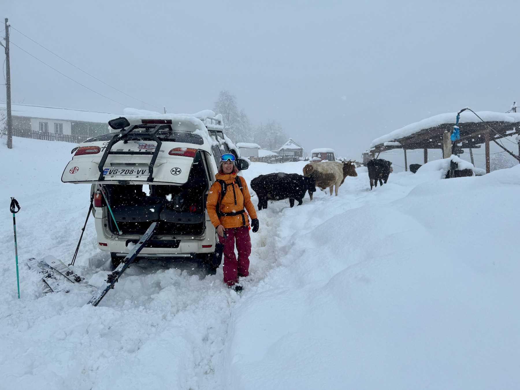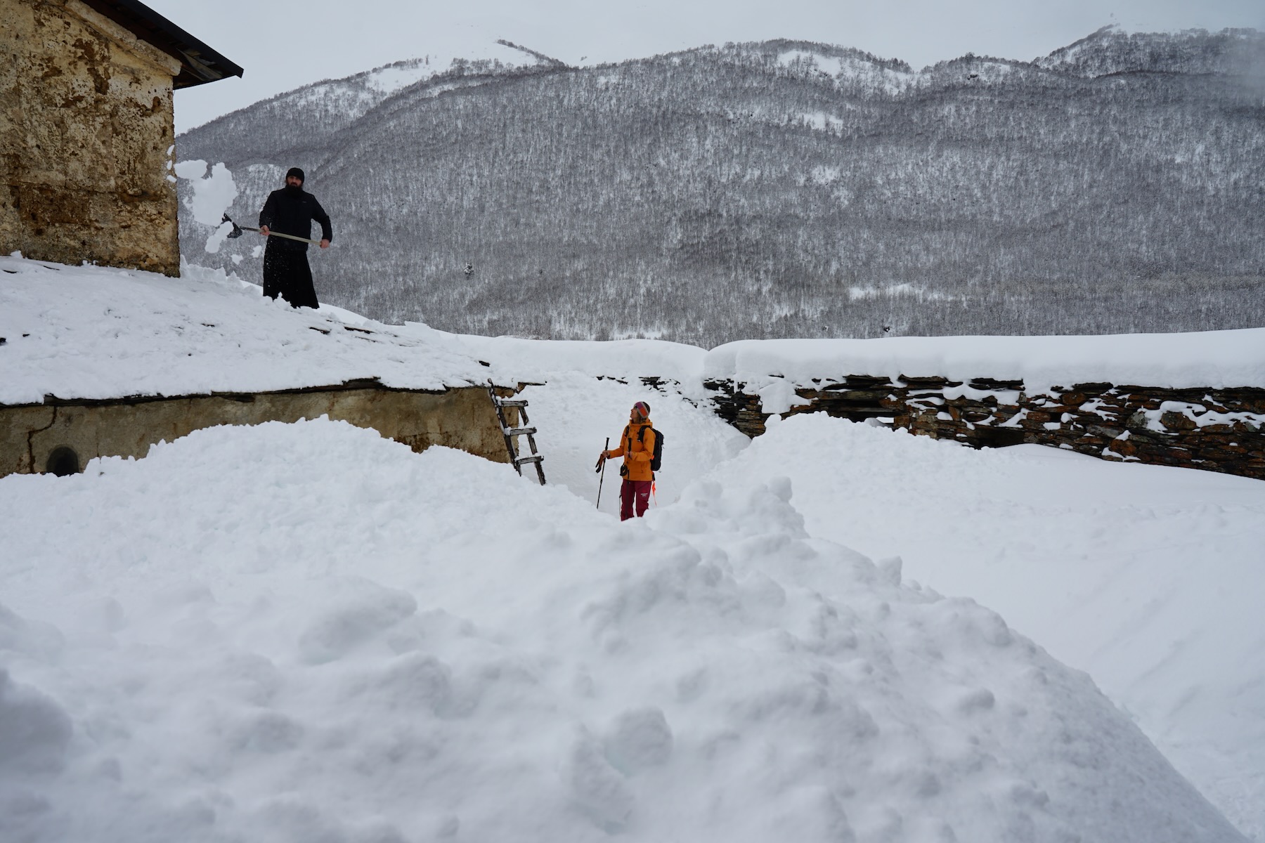 Von der Bergstation starten wir, wenn die Verhältnisse es zulassen zu einer kurzen Skitour. Eine lange Abfahrt über rund 1.300 Höhenmeter bringt uns anschließend bis in das entlegene Dorf Adishi, tief unten im Tal.