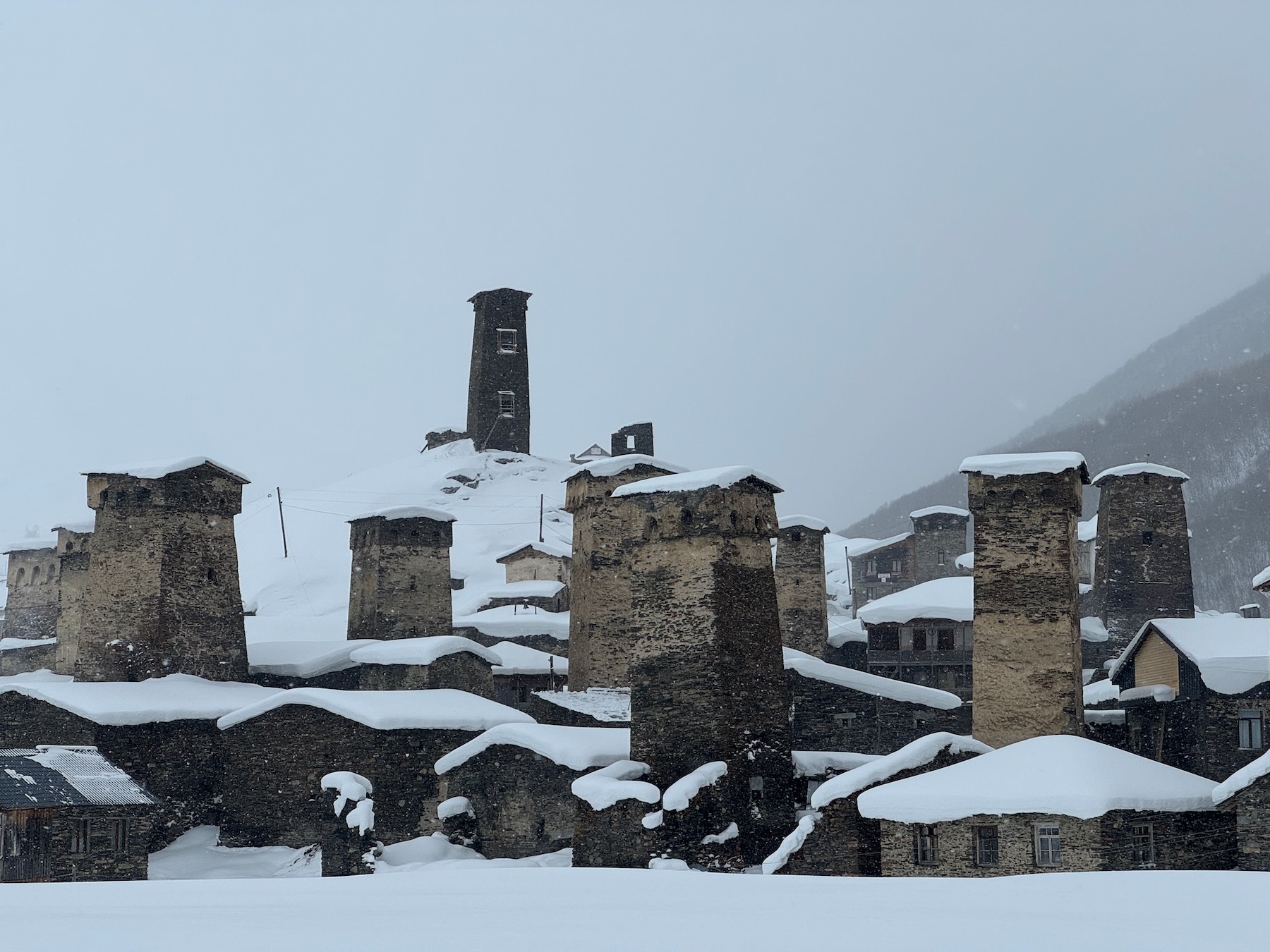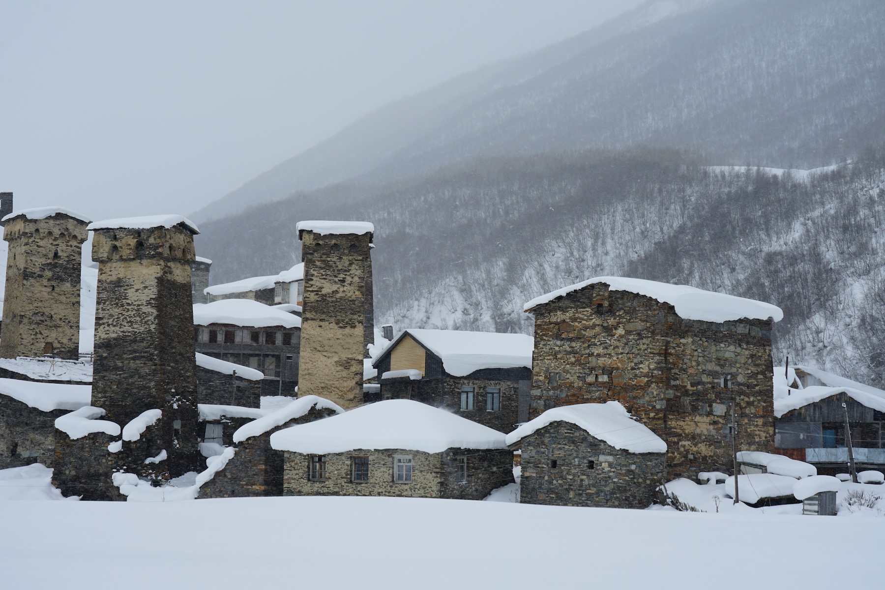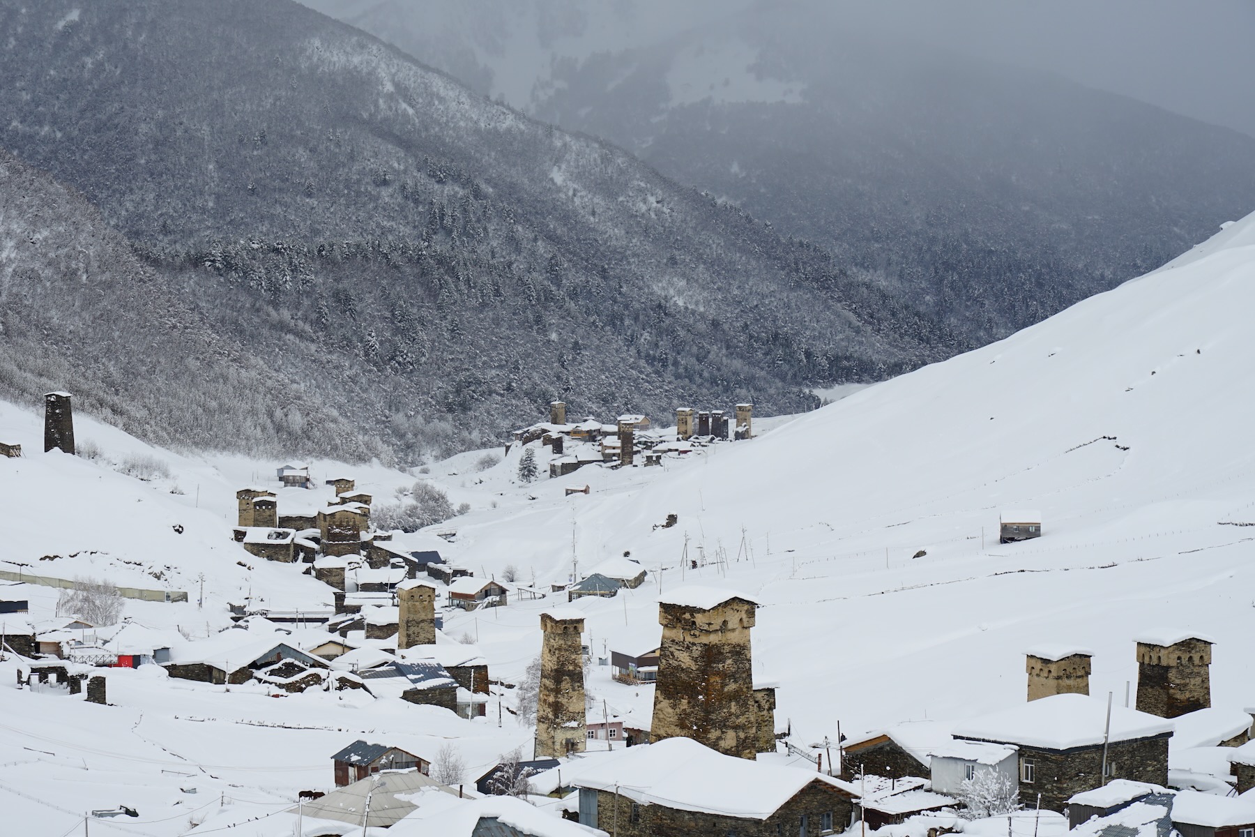 Die letzten Kilometer können bei Neuschnee schon eine Herausforderung für den Fahrer darstellen. Zum Glück ist Dato die Strecke schon unzählige Male gefahren. Gegen Mittag erreichen wir Mestia auf etwa 1.500 Metern Höhe, beziehen unsere Unterkunft, sortieren das Material und haben noch Zeit für einen kleinen Stadtrundgang – der lohnt sich!